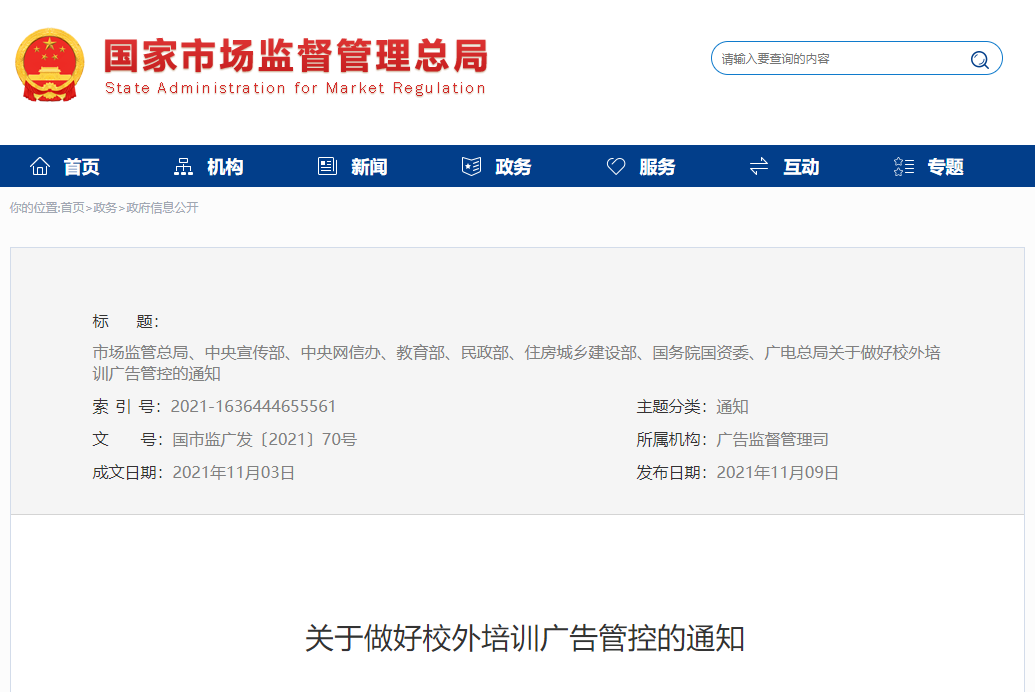 11月9日,国家市场监管总局等八部门共同研究出台了《关于做好校外培训广告管控的通知》(以下简称《通知》),对做好校外培训广告管控工作作出部署。和此前不同的是,《通知》明确指出,将不区分学科类、非学科类,做到主流媒体以及公共场所等线上线下空间不刊登、不播发面向中小学(含幼儿园)的校外培训广告。同时,对现有的校外培训广告要清理存量、杜绝增量。
