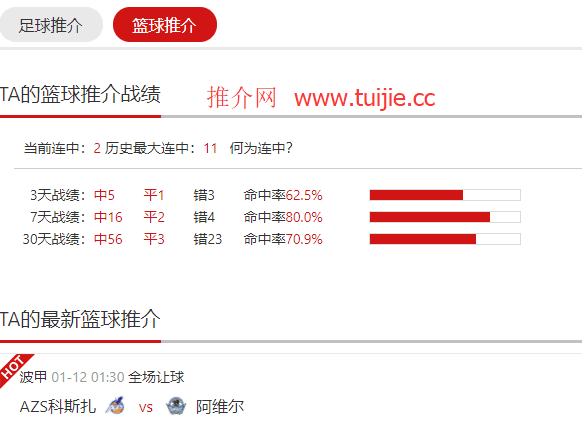 推介网篮球名家“北欧王”历史最大连中11场,7天战绩命中率达到80%。他最新发布了波甲必赢赛事推荐:比赛时间:2018-01-12 01:30;AZS科斯扎VS阿维尔,若想了解具体篮球推介详情,进入“推介网”并打开名家“北 ...