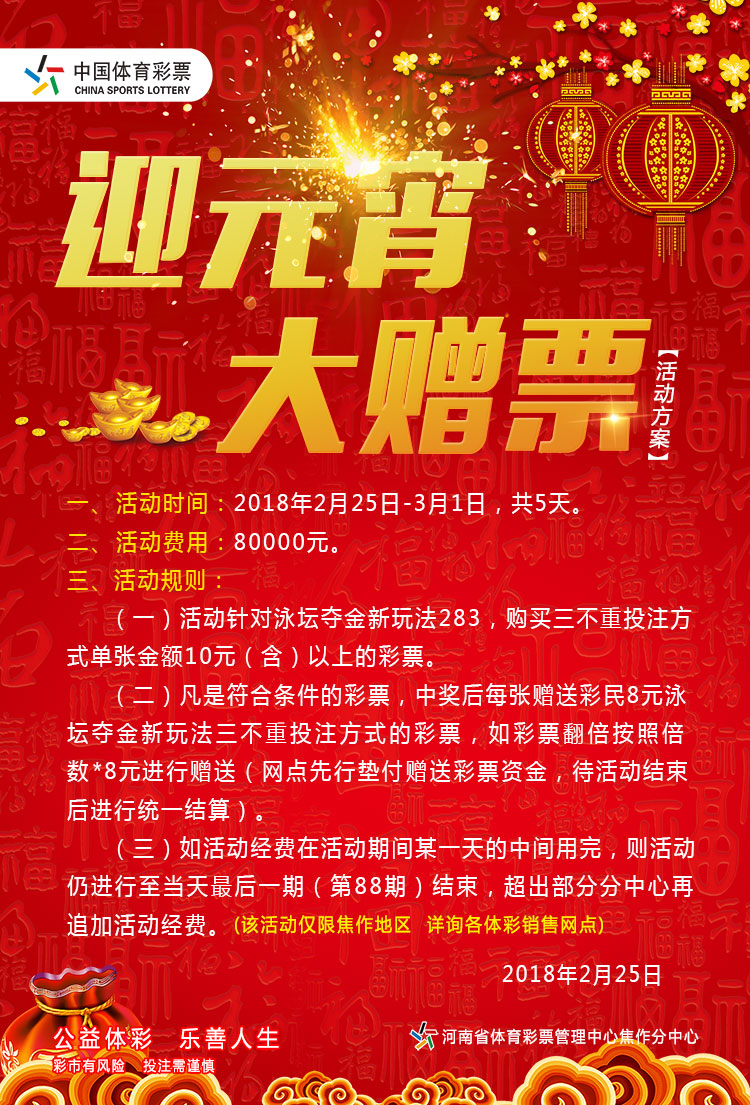 元宵佳节将至,为感谢广大彩民对中国体育彩票的大力支持与信赖,河南省体育彩票管理中心焦作分中心特推出“迎元宵,大赠票”的全新玩法!前所未有的福利,保证让您满意! “迎元宵 大赠票”活动 一、活动时间:2018 ...