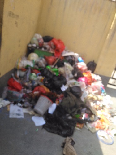 中轴物业于3月份收取建设西路汽配5号楼一年的卫生费后,拉了一交垃圾后就没动静了,如何这生活垃圾堆放近一个月,这是中轴物业的楼作!