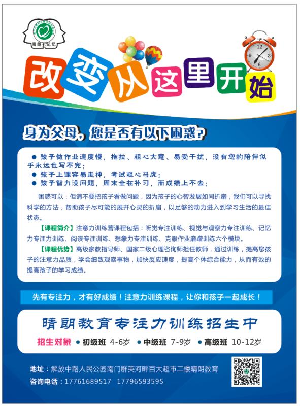 周六上午10:30----12:00快速阅读 周六下午3:00----5:00一到三年级专注力 周六下午5:00----7:00四到六年级专注力 报名咨询电话: 17761689517朋朋老师 身为父母,您是否有以下困惑? 孩子做作业速度慢,拖拉、粗心 ...
