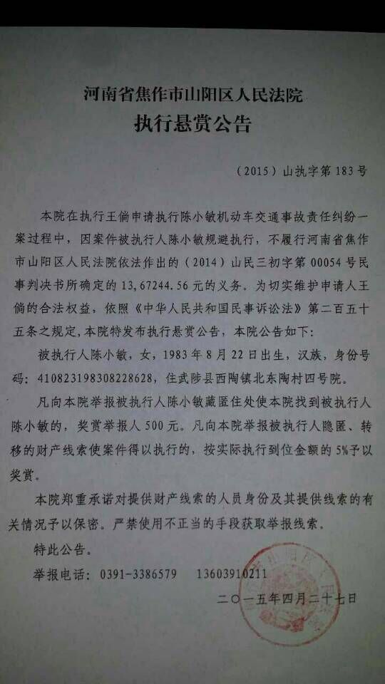 各位热心市民,王倘一案的肇事司机,至今为止下落不明,其丈夫周艳兵由于恶意转移资产,犯拒不执行法院判决罪,已被判刑一年,但判刑前没有任何赔偿,目前案件停滞,而唯一的突破口就是找到肇事司机本人。如有知道此 ...
