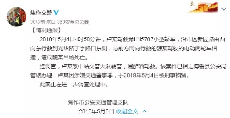 【情况通报】 2018年5月4日4时50分许,卢某驾驶豫HN5787小型轿车,沿市区新园路由西向东行驶到光华路丁字路口东侧,与前方同向行驶的魏某驾驶的电动两轮车相撞,造成魏某当场死亡。 经调查,卢某系中站交警大队辅警 ...