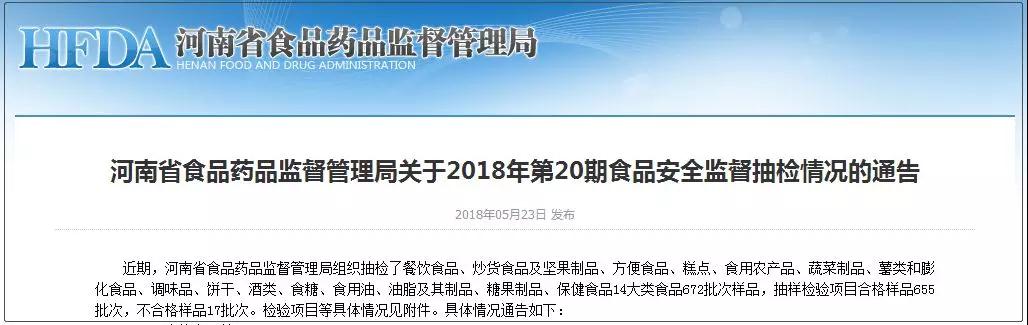 近日,从河南省食品药品监督管理局网站获悉, 在近期组织的食品抽检中, 共查出不合格食品17批次! ▼ 省食品药品监督管理局通报 不合格产品情况如下 焦作亿家美商贸有限公司销售的标称清徐县宋氏醋业有限公司生产 ...