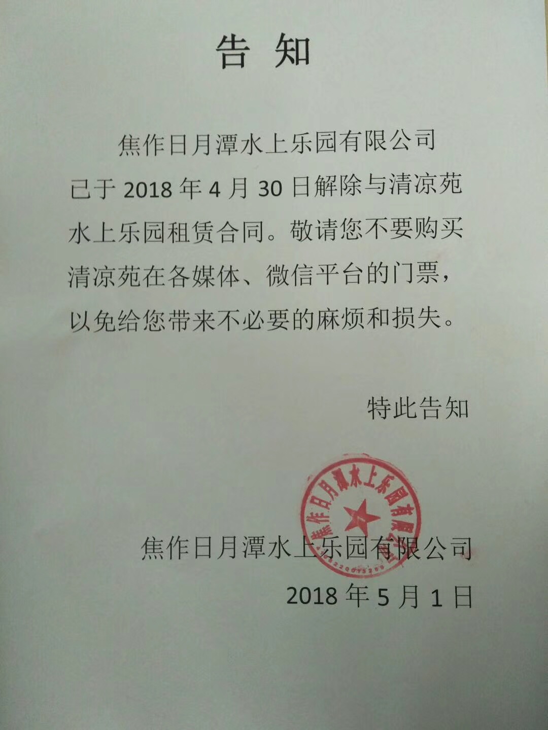 焦作日月潭水上乐园有限公司已于2018年4月30日解除与清凉苑水上乐园租赁合同。请您不要购买清凉苑在和媒体,微信平台的门票,以免给您带来不必要的麻烦和损失。 ...