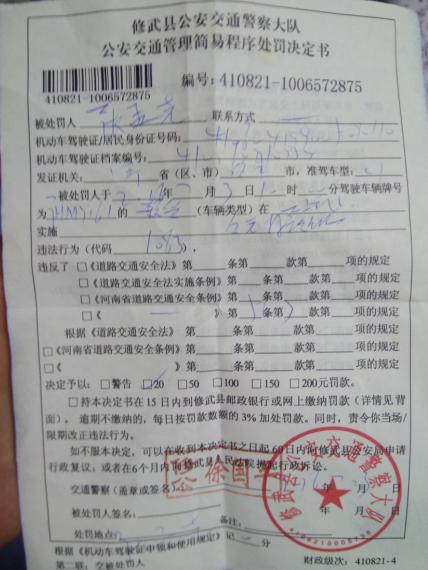 ![]() ![]() ![]() 这个开单的交警估计要挨批了!20元好像只有电动车才有的罚款标准,既然交警开单罚20,真要处罚200的话,没事找个律师起诉,打打官司…………自己认了的话,就老老实实交罚款! 自己选择…… 明白 |