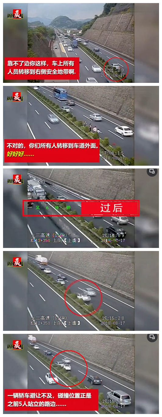 近日,在浙江境内的高速上,一周内连发两起与“二次事故”相关的案例。先看最近的这起。8月17日,浙江上三高速上,一辆轿车在快车道抛锚后,车内5人全部下车,站在车后的快速车道内报警待援,车后也未设置警示牌。浙 ...