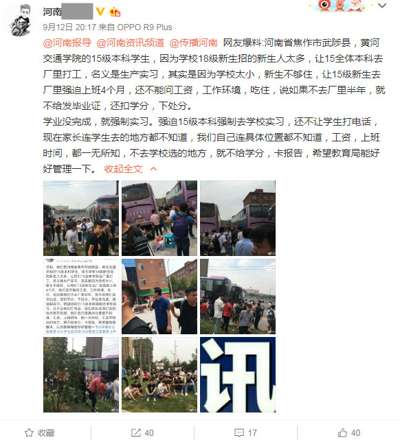“不能问工资!不能问环境、吃住!不去还不给毕业证、扣分、下处分!连电话都不能打!”这是真的么?这个大学咋能办出这事微博信息?微博信息近日,网上爆出焦作爆出河南省焦作市武陟县黄河交通学院的15级本科学生, ...