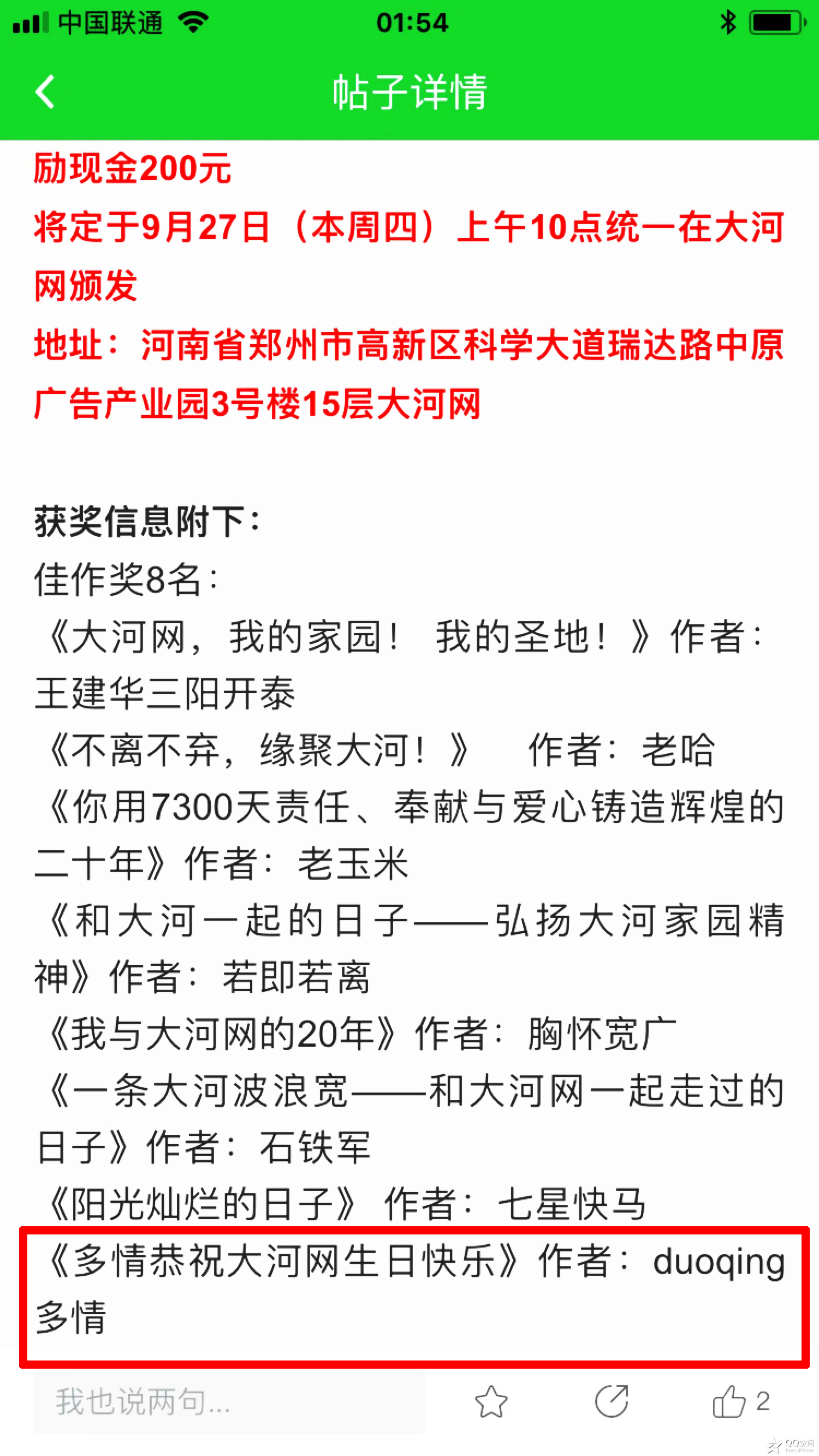 【多情絮语】昨天,始于8月7日的大河网成立20周年有奖征文大赛活动,成功举行!活动期间,共收到网友们提交的应征参赛稿件百余篇。按照“内容原创、有故事、有经历”的评选标准,评出了五个优秀奖,每人奖励500元, ...
