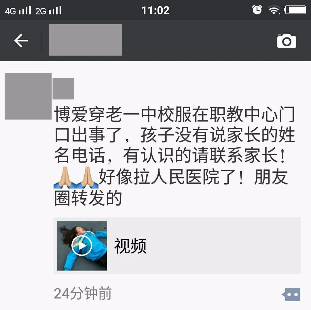 “博爱穿老一中校服在职教中心门口出事了,孩子没有说家长的姓名电话,有认识的请联系家长!好像拉人民医院了......”昨天上午,这样一则消息加视频开始在博爱朋友圈流传开。 朋友圈截图 小编有话说:博爱老一中 ...