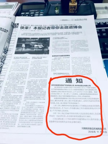 大河报2018年11月6日刊登河南锦润食品公司发给焦作市金得利房地产开发公司和焦作锦润房地产的通知