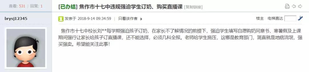 近段时间,关于学校“强制”订奶的问题,被众多学生家长所关注!这不,在9月份,就有网友发帖投诉: 网友: 您好!针对您反映的问题,现答复如下: “国 ...
