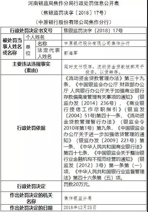 北京1月15日讯 中国银保监会网站15日公布了焦作银监分局对中原银行股份有限公司焦作分行的行政处罚决定书(焦银监罚决字〔2018〕17号)。 决定书显示,中原银行股份有限公司焦作分行法定代表人为郭海军 ...