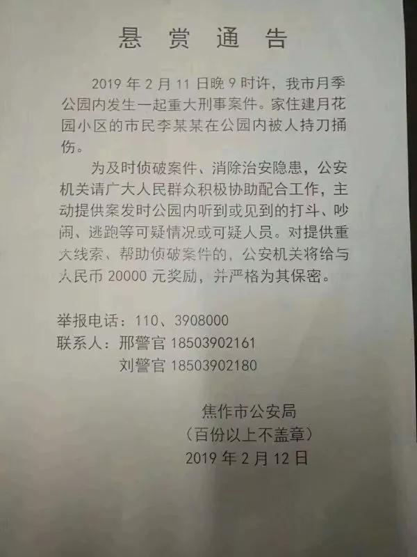月季公园发生重大刑事案件!焦作警方发布悬赏通告! ...