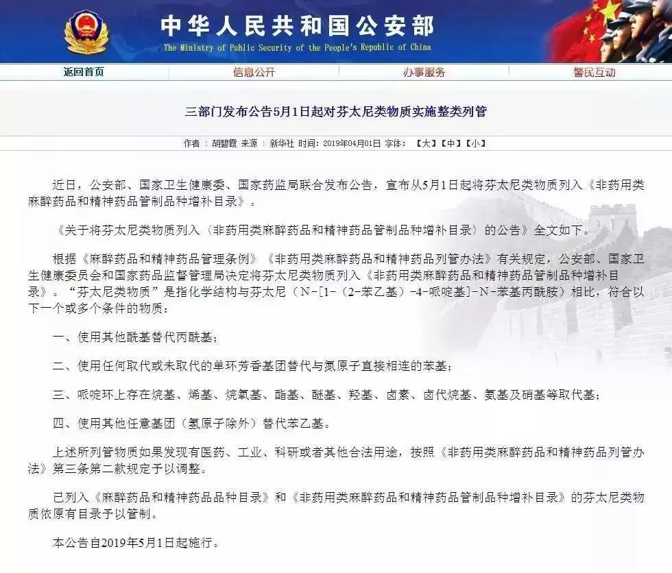 近日,公安部、国家卫健委、国家药监局联合发布公告,宣布从5月1日起将芬太尼类物质列入《非药用类麻醉药品和精神药品管制品种增补目录》。这意味着,数十种芬太尼类物质将整类列管为管制 ...