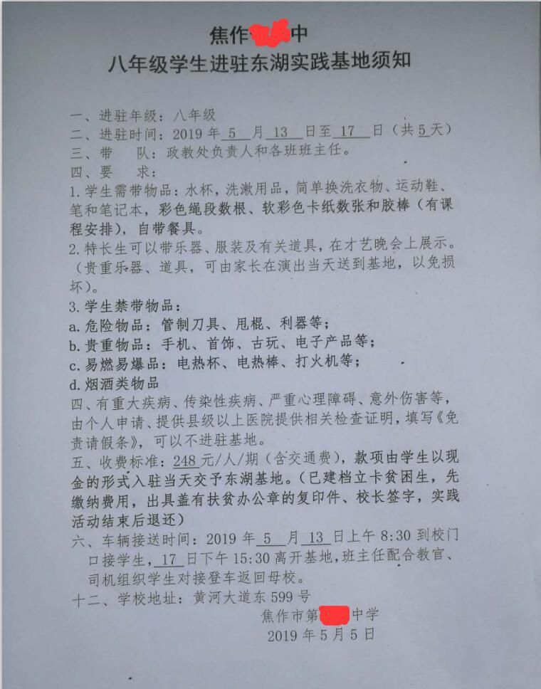网友您好: 中小学综合实践课程是国家教育部规定的中小学生必修课,有具体的课时规定。重在培养学生独立生活能力,团结协作吃苦耐劳精神。按照市教育局要求,我区每年组织小学四、五年级,初中一、二年级学生进驻实践基地开展综合实践活动,收费标准符合发改委和市教育局相关要求,费用由学生直接交给进驻基地。如果有生病和其他特殊情况不能参加此课程的学生可出具相关证明,由家长签字,学校准许后可以不参加。 解放区教育局 2019年5月13日 |