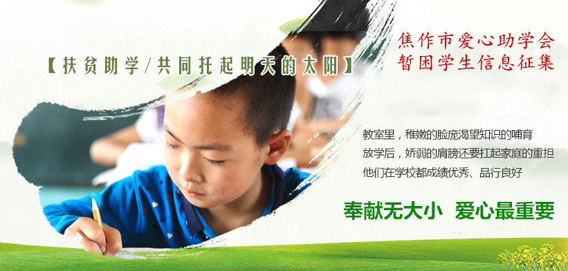 焦作市爱心助学会——贫困学生家庭信息征集公告[url=]焦作市爱心助学会[/url] 孩子是父母的宝贝,是家庭的希望,孩子是国家的未来。 梁启超先生说“少年强则国强”。 ...