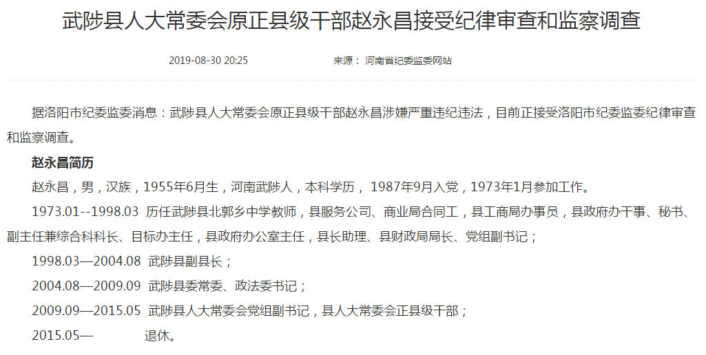 武陟县人大常委会原正县级干部赵永昌接受纪律审查和监察调查 据洛阳市纪委监委消息:武陟县人大常委会原正县级干部赵永昌涉嫌严重违纪违法,目前正接受洛阳市纪委监委纪律审查和监察调查。 赵永昌简历: 赵永昌 ...
