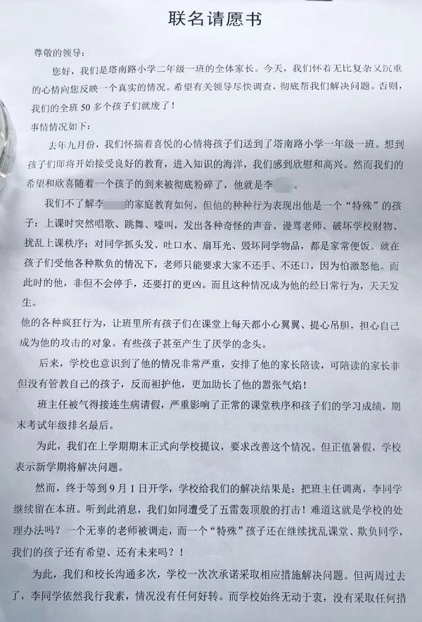 塔南路小学一班级50多名家长联名发表请愿书!
