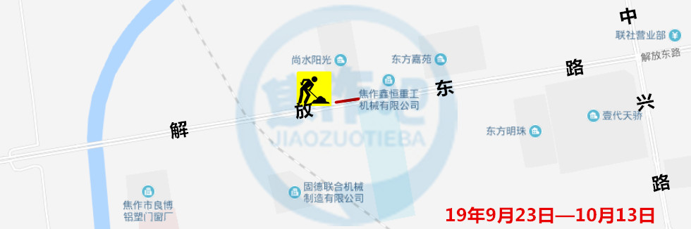 公告通知 因焦作市城市集中供热管网建设,自2019年9月23日—2019年10月13日需对解放东路尚水阳光小区前道路进行分段封闭施工。为确保施工期间行人和车辆安全,请广大市民积极配合,因施工造成通行不便,敬请谅解。 ...