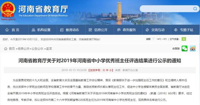 10月15日 河南省教育厅发布通知 2019年度全省中小学优秀班主任 评选结果公示! 河南省教育厅关于对2019年河南省中小学优秀班主任评选结果进行公示的通知 为全面贯彻党的十九大和全国、全省教育大会及全国基础 ...