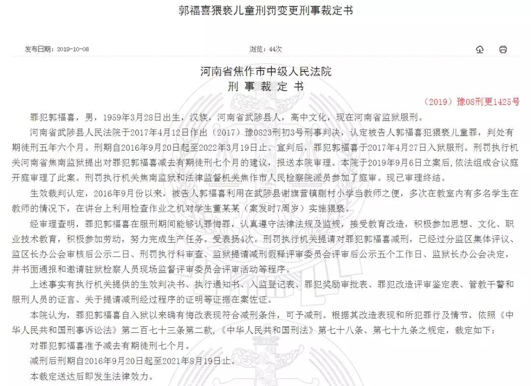 罪犯郭福喜,男,1959年3月28日出生,汉族,河南省武陟县人,高中文化,现在河南省监狱服刑。 河南省武陟县人民法院于2017年4月12日作出(2017)豫0823刑初3号刑事判决,认定被告人郭福喜犯猥亵儿童罪,判处有期徒 ...
