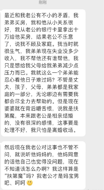 | 从老公卡里拿出十万帮弟弟买房,你怎么不用自己卡里的钱?你拿人家十万都不打招呼的吗 |