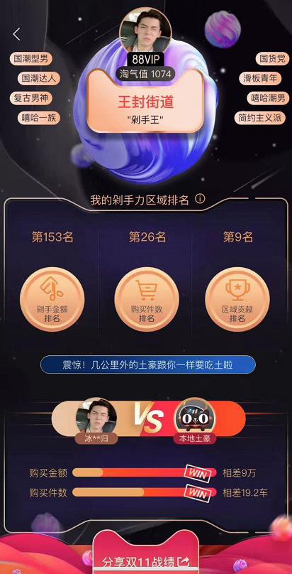 打开淘宝,搜索“我的双十一战绩”看看你的排名和土豪之间的距离~ 然后晒出来吧~ 看看你的消费能力! 以下是2019年天猫双十一总成交额的几个记录时刻: 1 分钟,超 65 亿! 1 分 36 秒,超 100 亿! 5 分 25 秒,超 30 ...