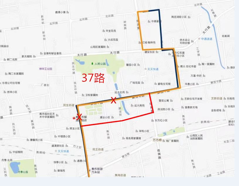 关于变更37路绕行路线的通告 广大市民朋友: 为发挥运力资源最大效能,根据解放路施工通行情况,公交集团公司将于11月13日变更37路绕行路线,原绕行的太行路段改为解放路、和平街,具体如下: 上行:缝山公园公交 ...