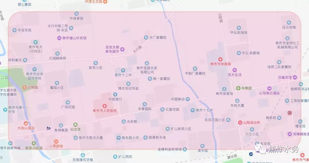 尊敬的市民朋友: 因太行水厂周庄路DN400mm供水管道突发爆管,需紧急抢修。为避免影响广大市民中午用水,焦作水务公司定于午后13:00实施停水进行抢修。 停水范围:新月铁路以北,群英河以 ...