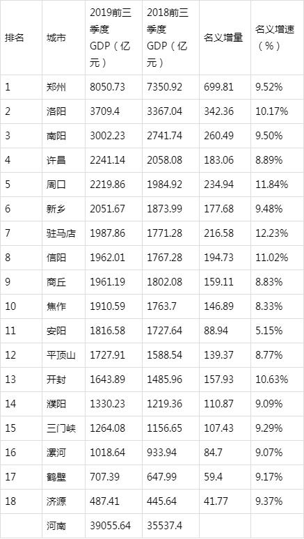 河南省第三季度gdp已经出炉,全省前三季度gdp总量达到了39055.64亿元,扣除价格因素后,实际增长速度为7.4%。郑州三个季度gdp达到8050.73亿元,居河南首位,洛阳、周口、驻马店、信阳和开封的名义GDP增长速度超过10% ...