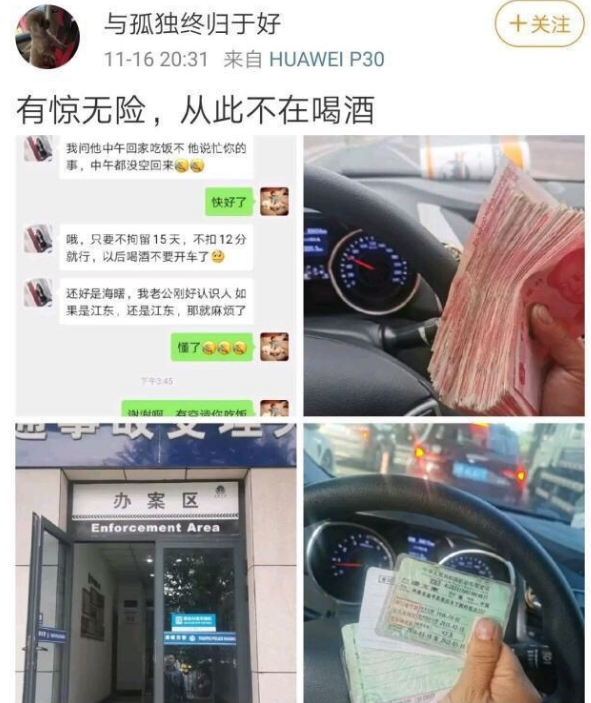 今日,网名为 @与孤独终归于好的 微博网友在其个人微博账号下晒酒驾后未被处罚的照片,他写到:有惊无险,从此不在喝酒。虽是受惊之后的感言,但是言语之间充满得意。 ...