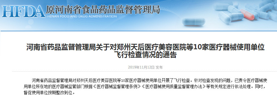河南省药品监督管理局对郑州天后医疗美容医院等10家医疗器械使用单位开展了飞行检查。其中,焦作市第四人民医院、焦作卫生医药学校医疗美容诊所各被查出5项问题! 针对检查发现的问题,已责令医疗器械使用单位所在 ...