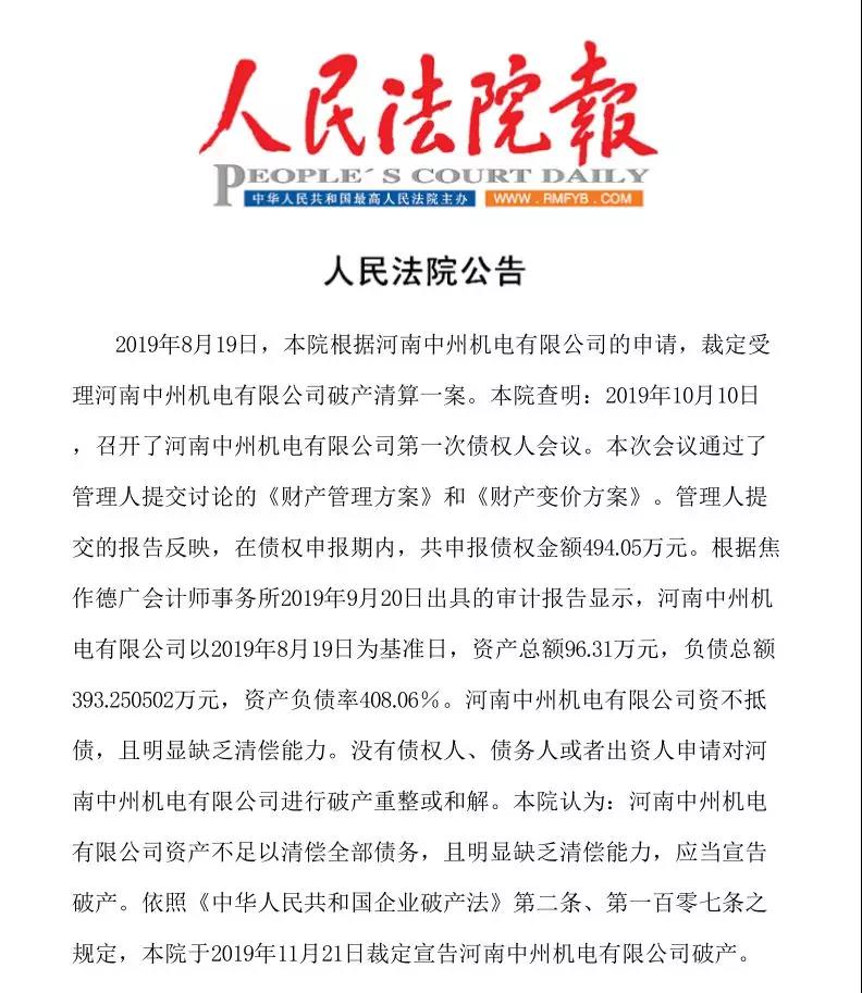 人 民 法 院 公 告 2019年8月19日,本院根据河南中州机电有限公司的申请,裁定受理河南中州机电有限公司破产清算一案。本院查明:2019年10月10日,召开了河南中州机电有限公司第一次债权人会议。本次会议通过了管理 ...