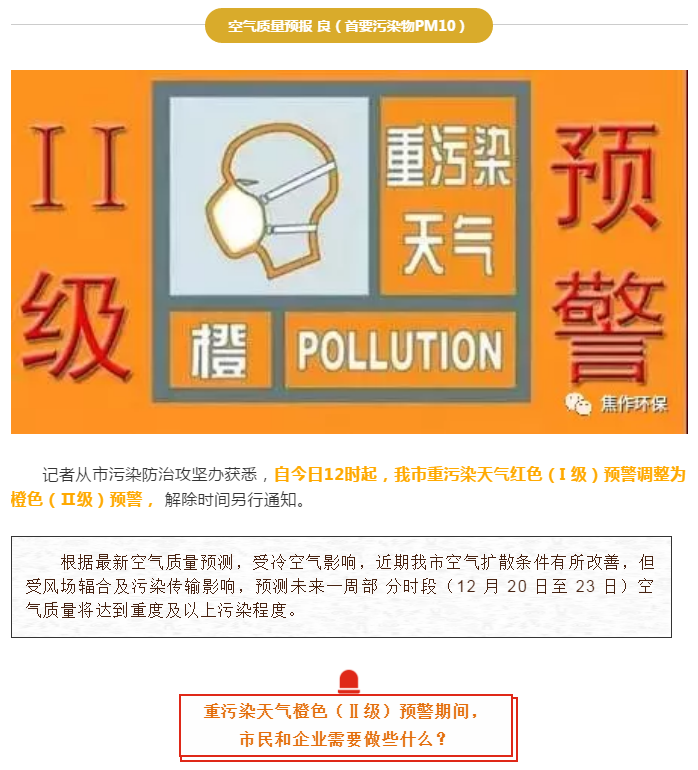 今天12时起,我市重污染天气预警由红色(I 级)降为橙色( ...