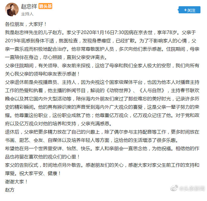 1月16日早间,赵忠祥之子赵方在赵忠祥个人社交媒体上发布赵忠祥逝世的消息。