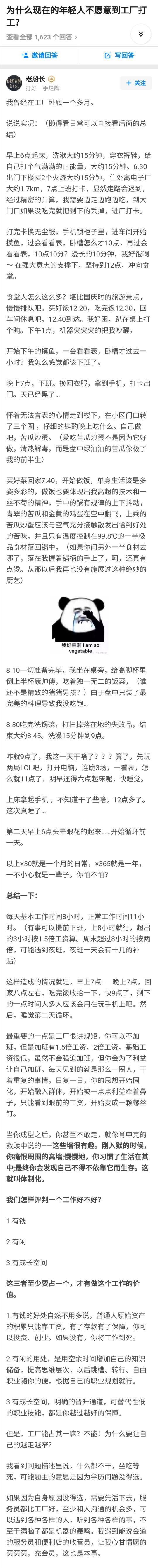 | 打过暑假工,基本一模一样,但是是工作到九点的那种,两周休一天,每天简单而枯燥,还有人盯着,简直不能过,长期肯定不行,那个工厂要么是一二十的妹子(高中或初中毕业),要么是四五十的阿姨,一个个皮肤面色都不好看,反正不会再去,读书反正意味着你有更多一点的出路 |