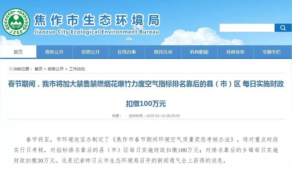 春节将至,市环境攻坚办制定了《焦作市春节期间环境空气质量奖惩考核办法》,将对重点时段实行日考核,对指标排名靠后的县(市)区每日实施财政扣缴100万元;对排名靠后的乡镇每日实施财政扣缴30万元。 ...