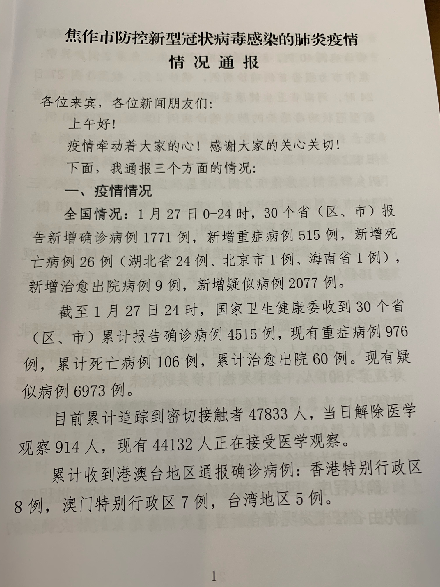 各位来宾,各位新闻朋友们: 上午好! 疫情牵动着大家的心!防控责任重大!生命重于泰山!下面,我通报三个方面的情况: 一、疫情情况 全国情况:1月27日0-24时,30个省(区、市)报告新增确诊病例1771例,新增重 ...