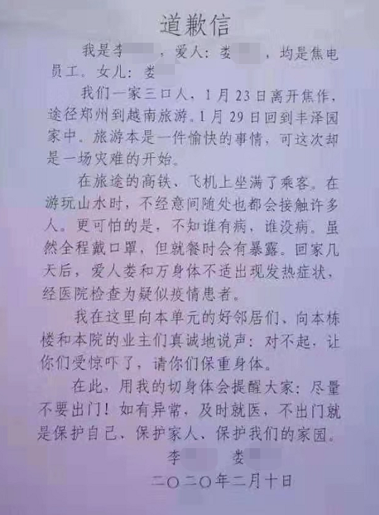 确诊详情: 患者1:李某某,女,48岁,在焦作市解放区丰泽园居住。2020年1月23日,患者从焦作到越南旅游,1月29日乘火车(C2876-08车-无座)返焦。2月2日晚,在丹尼斯超市购物约2小时;2月4日,在政二街丰泽园 ...