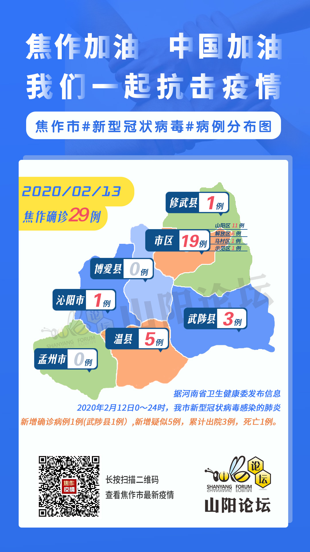 据河南省卫生健康委发布信息,2020年2月12日0-24时,我市新增新冠肺炎确诊病例1例(武陟县1例)。新增疑似病例5例,排除疑似病例9例。 截至2月12日24时,我市累计新冠肺炎确诊病例29例(沁阳市1例、武陟县3例、修武 ...