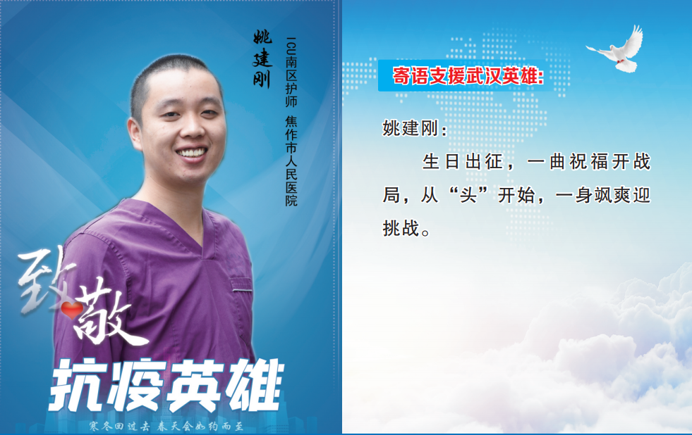 “我志愿加入中国共产党……不论生死、不计报酬!” 这是焦作市人民医院危重症监护科护士姚建刚,在武汉战“疫”第一天递交的入党申请书中的话语。而这一天,正是他30岁生日。 姚 ...