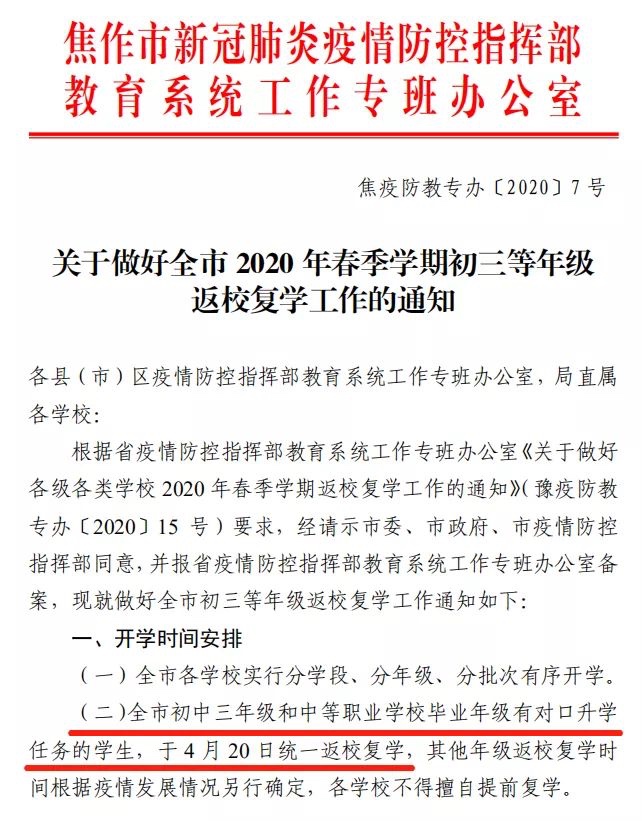 记者今天从市新冠肺炎疫情防控指挥部教育系统专班办公室了解到,全市初中三年级和中等职业学校毕业年级有对口升学任务的学生,于4月20日统一返校复学,其他年级返校复学时间根据疫情发展情况另行确定,各学校不得擅 ...