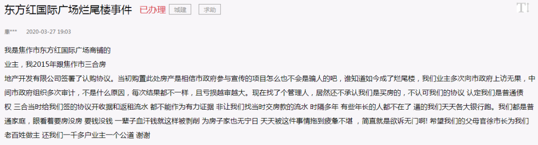 焦作东方红国际广场围满了人,业主们迟迟拿不到房子,现场有负责人在出面处理... 您的设备不支持视频标签。 您的设备不支持视频标签。 您的设备不支持视频标签。 此前有网友在政府领导留言板上反映过此事, ...