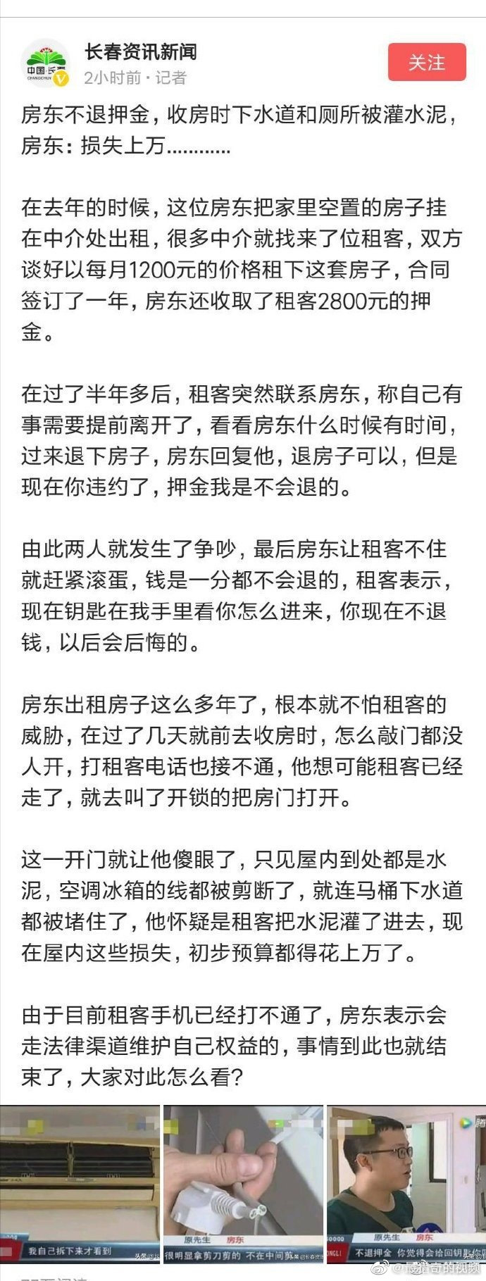 房东不退押金,收房时下水道和厕所被灌水泥,房东损失上万,大家怎么看?