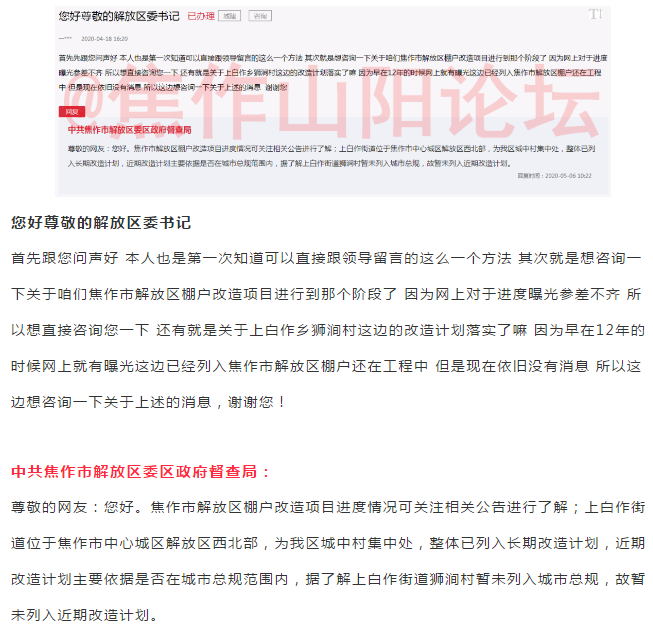 近日,在【领导留言板】官网上看到有网友咨询市区棚户区的拆迁问题,中共焦作市解放区委区政府督查局正式回应了网友们所咨询的问题: 焦作这里确定不拆了! ...