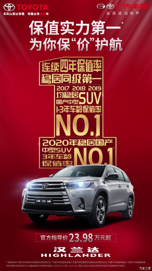 汉兰达保值率连续四年同级第一!广汽丰田全新汉兰达城市豪华型SUV首选汉兰达,7座空间,内外兼修不仅拥有霸气外观、超大空间,动力总成采用的是2.0T原装进口发动机,其中核心等级及以上版本标配TSS安全套装,全面提 ...