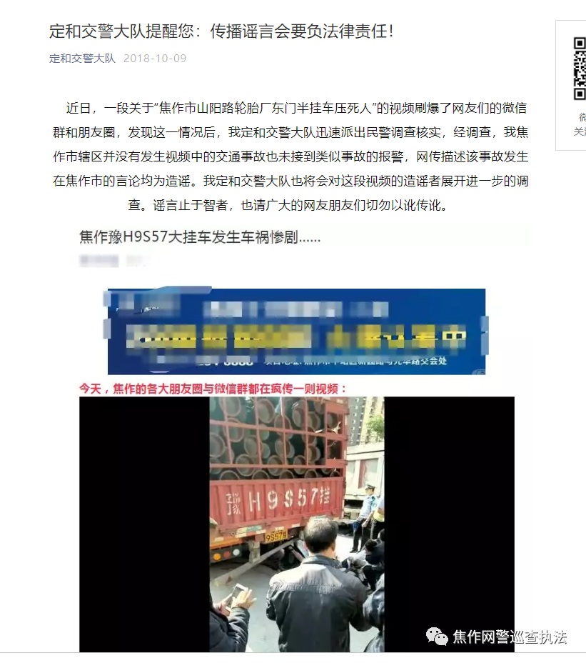 近日,焦作本地朋友圈中流传一段牌照为“豫H9S57挂”的半挂车压死人的视频,视频内容引起了本地网民的热议。 经网警核实,此事件早在2018年10月,已被焦作市公安局交警支队定和交警大队进行了辟谣:此视频为谣言信 ...
