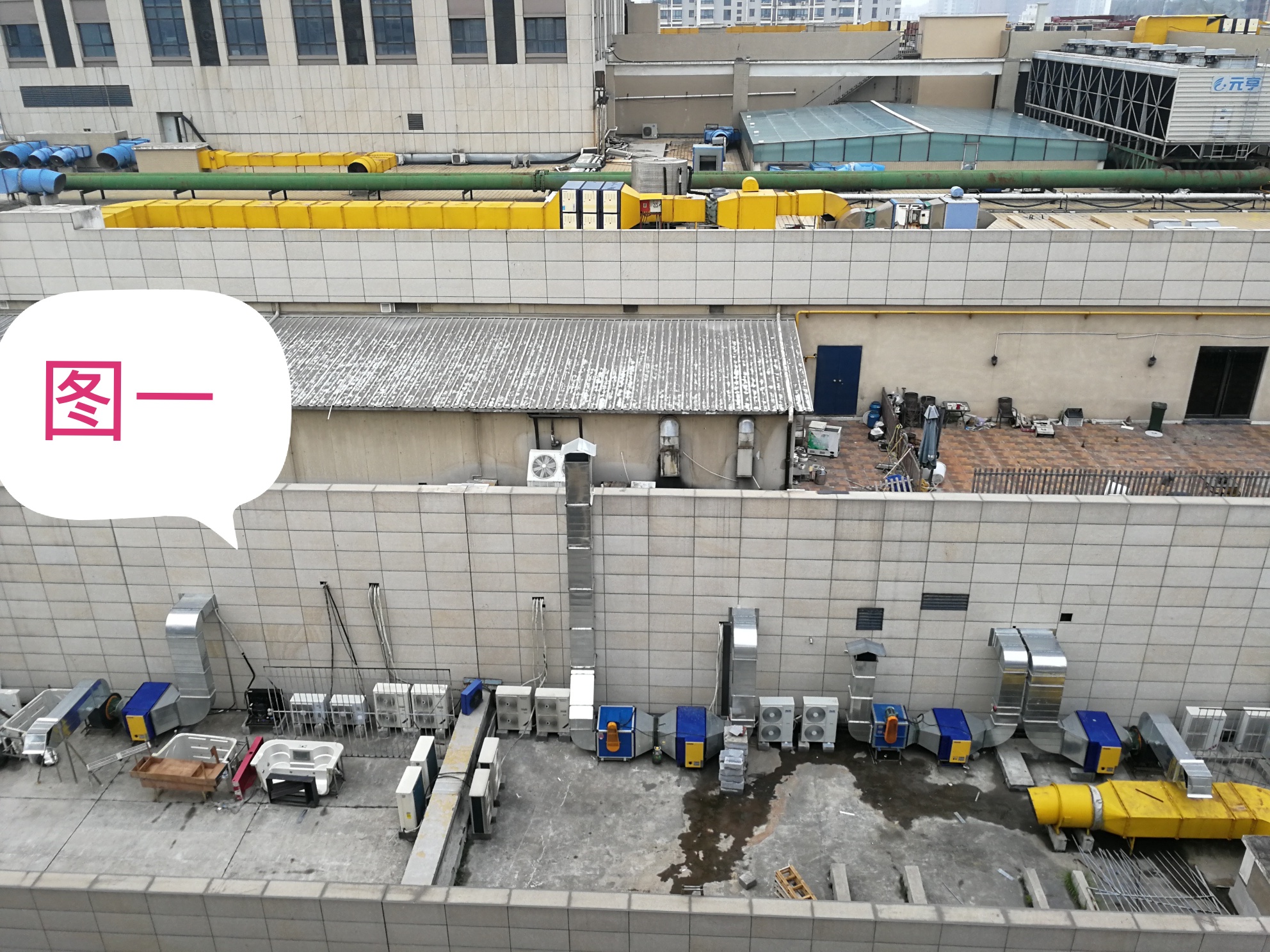 王府井楼上烟道发出的噪音轰隆作响,令附近居民寂食难安,不堪其扰,噪音长期维持在60分贝仪上(图一图二);小区楼道电梯间停满了电瓶车(见图三);楼道内消防通道被堵得严严实实(见图四);一条消防水管在院内扔了俩月有余无人清理(图五)