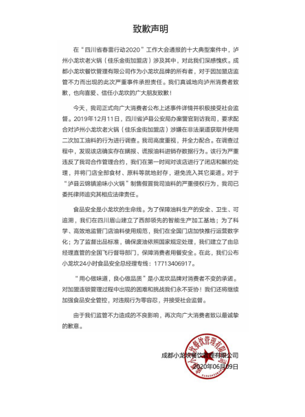 6日10日,著名火锅品牌小龙坎、蜀大侠就泸县云锦镇渝味小火锅用回收食品作为原料生产食品案作出致歉声明↓↓↓ 1月5日被举报使用回油的3家火锅店关门停业江阳区市场监管局组建专案组对上述3家火锅店立案调查 6月8 ...